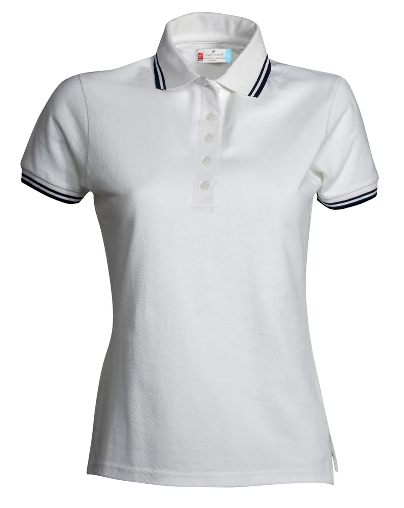Women’s short-sleeved fitted polo shirt with 5 white buttons, fine contrasting collar and sleeve trim, rib collar and sleeve edging, side vents with reinforced seams, concealed collar stitching, side reinforcement tape, stretch seams, inner neck tape