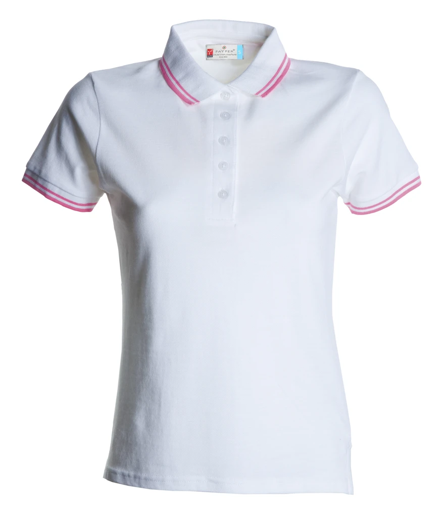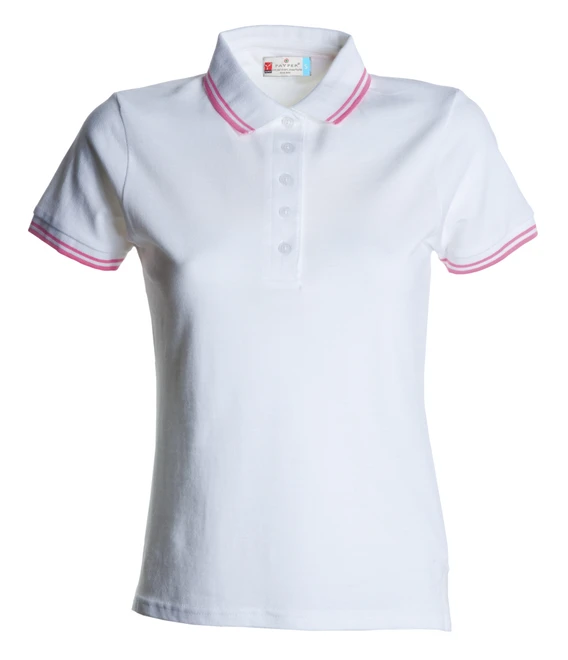 Women’s short-sleeved fitted polo shirt with 5 white buttons, fine contrasting collar and sleeve trim, rib collar and sleeve edging, side vents with reinforced seams, concealed collar stitching, side reinforcement tape, stretch seams, inner neck tape