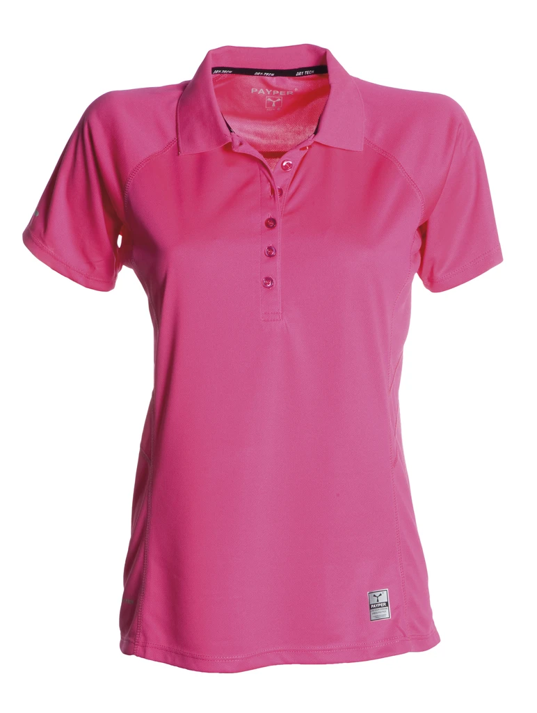 Women’s fitted technical polo shirt with 6 matching buttons, raglan sleeves, double stitched side seams for a more tailored fit, fitted bottom and longer at the back, reflective insert on the sleeves and back of collar, contrasting neck tape, transfer label