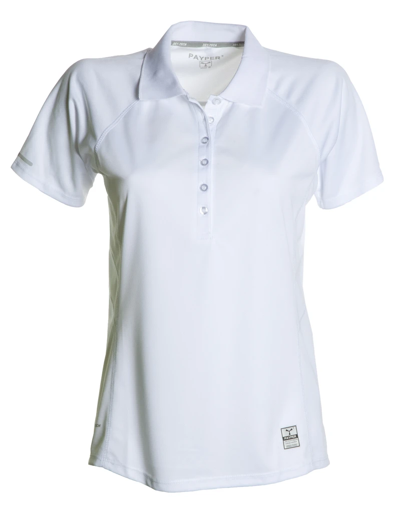 Women’s fitted technical polo shirt with 6 matching buttons, raglan sleeves, double stitched side seams for a more tailored fit, fitted bottom and longer at the back, reflective insert on the sleeves and back of collar, contrasting neck tape, transfer label