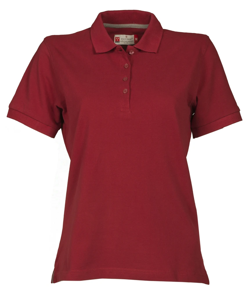 Women’s short-sleeved fitted polo shirt with 4, matching, mother-of-pearl effect buttons, rib collar and sleeve edging, side vents, concealed collar stitching with contrasting tape, stretch seams, side reinforcement tape, inner neck tape