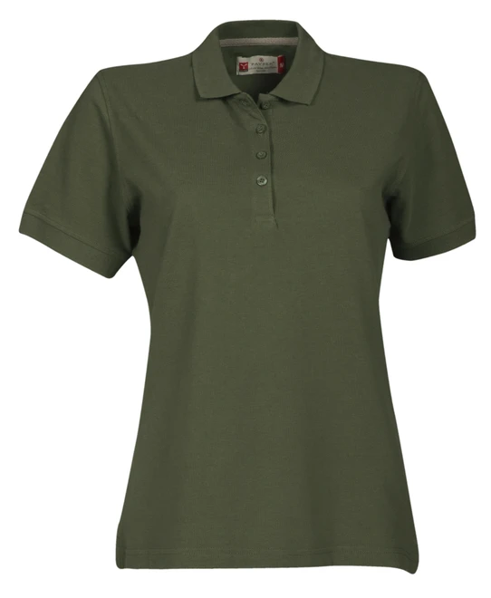 Women’s short-sleeved fitted polo shirt with 4, matching, mother-of-pearl effect buttons, rib collar and sleeve edging, side vents, concealed collar stitching with contrasting tape, stretch seams, side reinforcement tape, inner neck tape