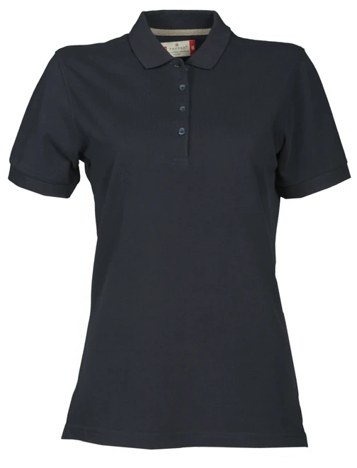 Women’s short-sleeved fitted polo shirt with 4, matching, mother-of-pearl effect buttons, rib collar and sleeve edging, side vents, concealed collar stitching with contrasting tape, stretch seams, side reinforcement tape, inner neck tape