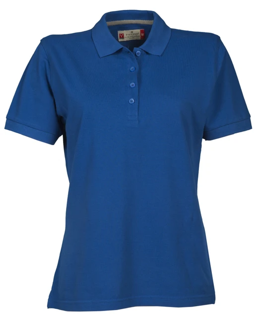 Women’s short-sleeved fitted polo shirt with 4, matching, mother-of-pearl effect buttons, rib collar and sleeve edging, side vents, concealed collar stitching with contrasting tape, stretch seams, side reinforcement tape, inner neck tape