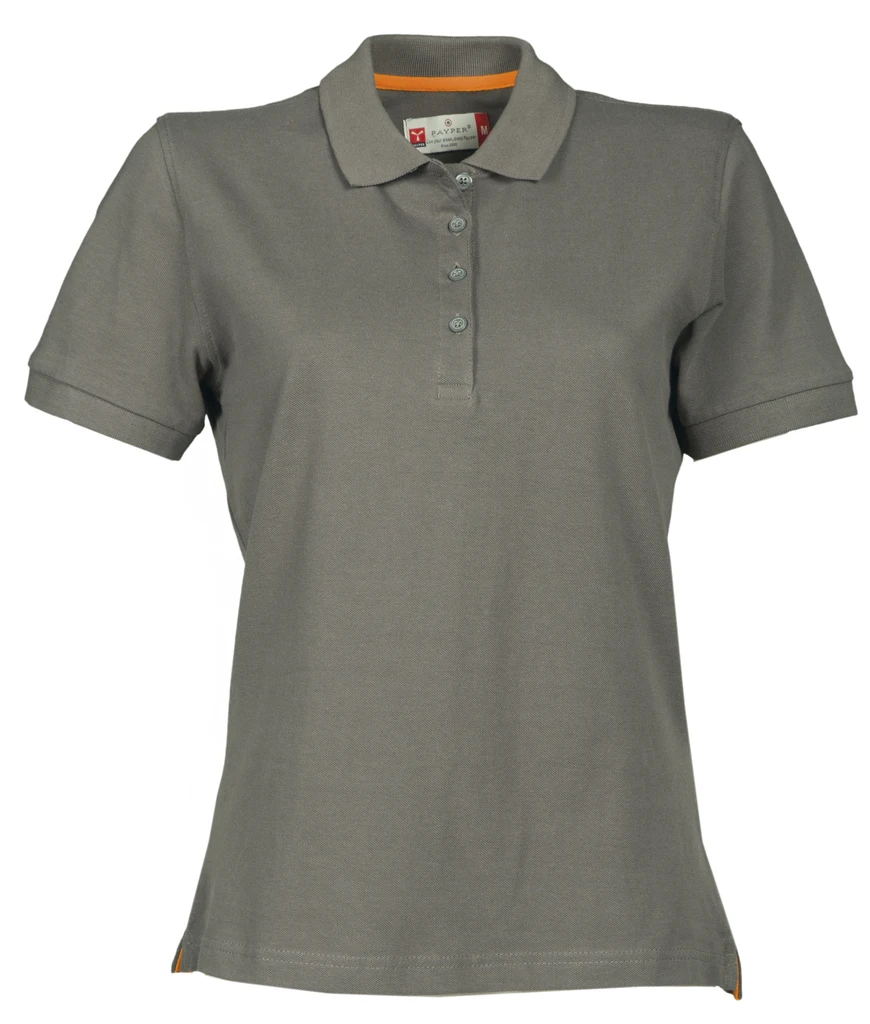 Women’s short-sleeved fitted polo shirt with 4, matching, mother-of-pearl effect buttons, rib collar and sleeve edging, side vents, concealed collar stitching with contrasting tape, stretch seams, side reinforcement tape, inner neck tape