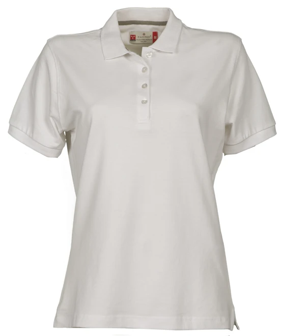 Women’s short-sleeved fitted polo shirt with 4, matching, mother-of-pearl effect buttons, rib collar and sleeve edging, side vents, concealed collar stitching with contrasting tape, stretch seams, side reinforcement tape, inner neck tape