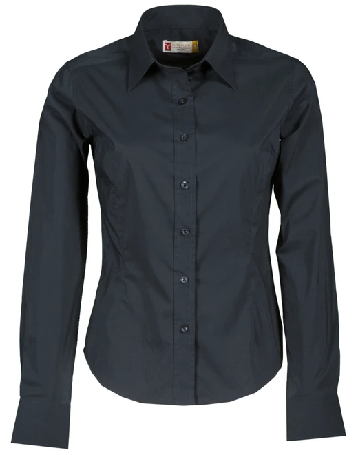 Women's fine weave combed cotton fitted shirt, pleats at the front and back, Italian-style collar, tailored cuff with 2 buttons and button hole, stitched placket with matching buttons. With yoke. Easy-care fabric