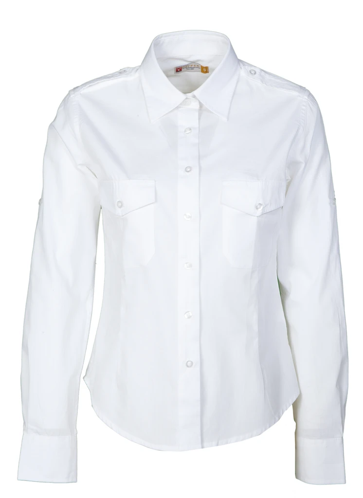 Women’s fine weave combed shirt, slightly tailored, pleats at the front and back, Italian-style collar, tailored cuff with 2 buttons and button hole, stitched placket with matching buttons and red buttonholes (apart from the white version), shaped yoke at the front (apart from the white version), shoulder tabs, two breast pockets with flap, roll up sleeves with button and tab
