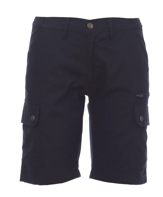 Women’s Bermuda shorts with side elastic and waist belt loops. Zip fastening with metal button, two front pockets, two side pockets with flaps and snap fasteners, one left zip pocket, one foldaway tape measure pocket on the right, two slit back pockets with button and buttonhole