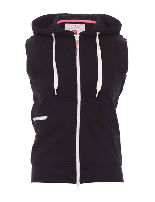 Women's sleeveless hoodie, full plastic zip in contrasting colour with double metal pull, shaped hood and drawstring in contrasting colour, kangaroo pocket with small zip pocket