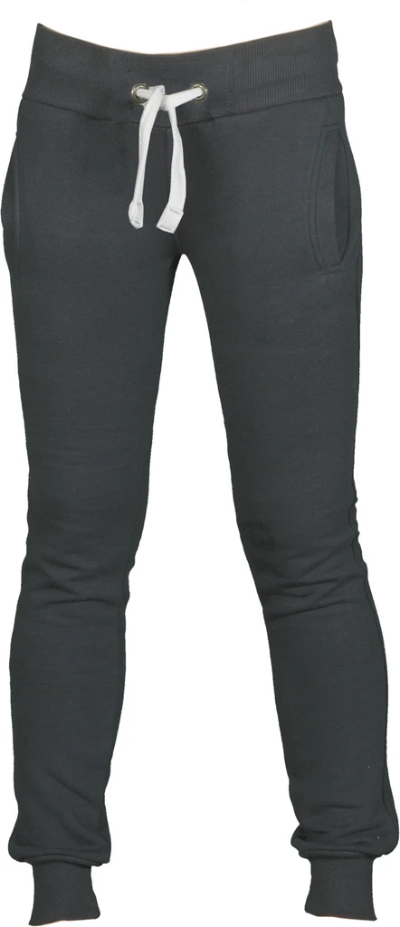 Women’s sweatpants with stretch rib at the waist and bottom of the legs, white drawstring with contrasting stitching and metal rings, two front pockets with rib and reinforced seams