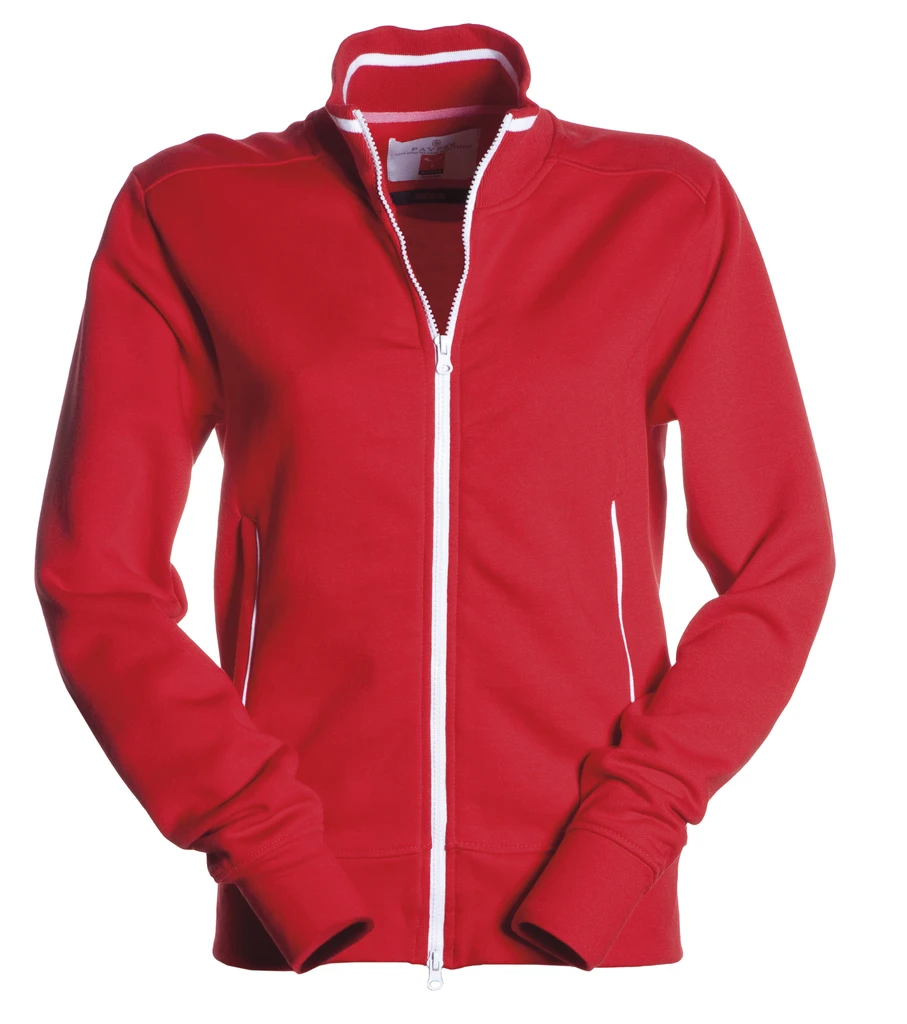 Women’s fitted sweatshirt with full, contrasting coloured plastic SBS zip with double metal pull; rib collar with contrasting trim, side pockets with