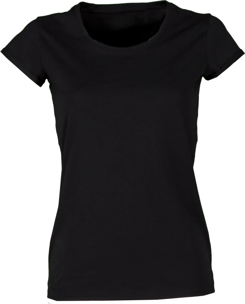 With scooped neck, low 1 cm spandex mix collar, short sleeves with narrow raw finish turn-up, shoulders with double stitched seams inside, sleeves with narrow raw finish turn-up, side seams, no label
