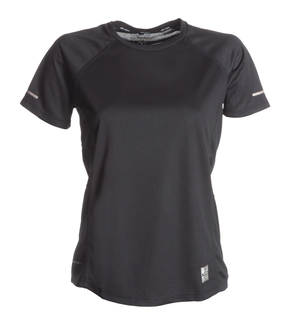 Women’s technical/sports fitted t-shirt with raglan sleeves, double stitched side seams for greater comfort, shaped bottom and longer at the back, reflective insert on the sleeves and back of collar, contrasting neck tape, transfer label