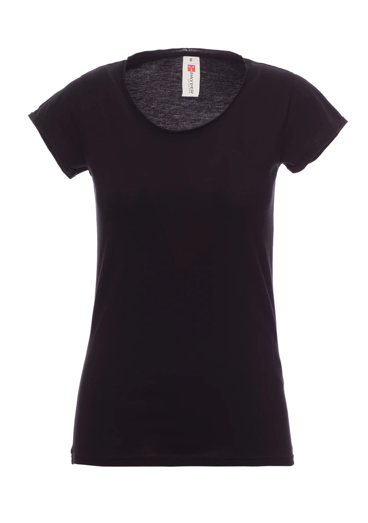 Women’s fitted short-sleeved T-shirt with scooped raw finish neck, shoulders with double stitched seams inside, sleeves with narrow raw finish turn-up, side seams, transfer label