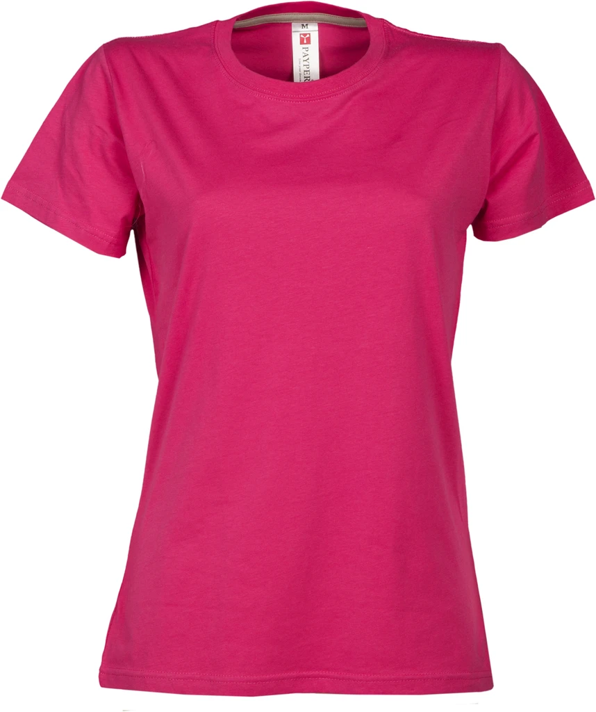 Women’s short-sleeved crew neck fitted t-shirt, with 1.5 cm spandex mix rib neckband with top stitching on the front, contrasting shoulder-to-shoulder reinforcement tape visible on the inside collar, stretch seams, side seams