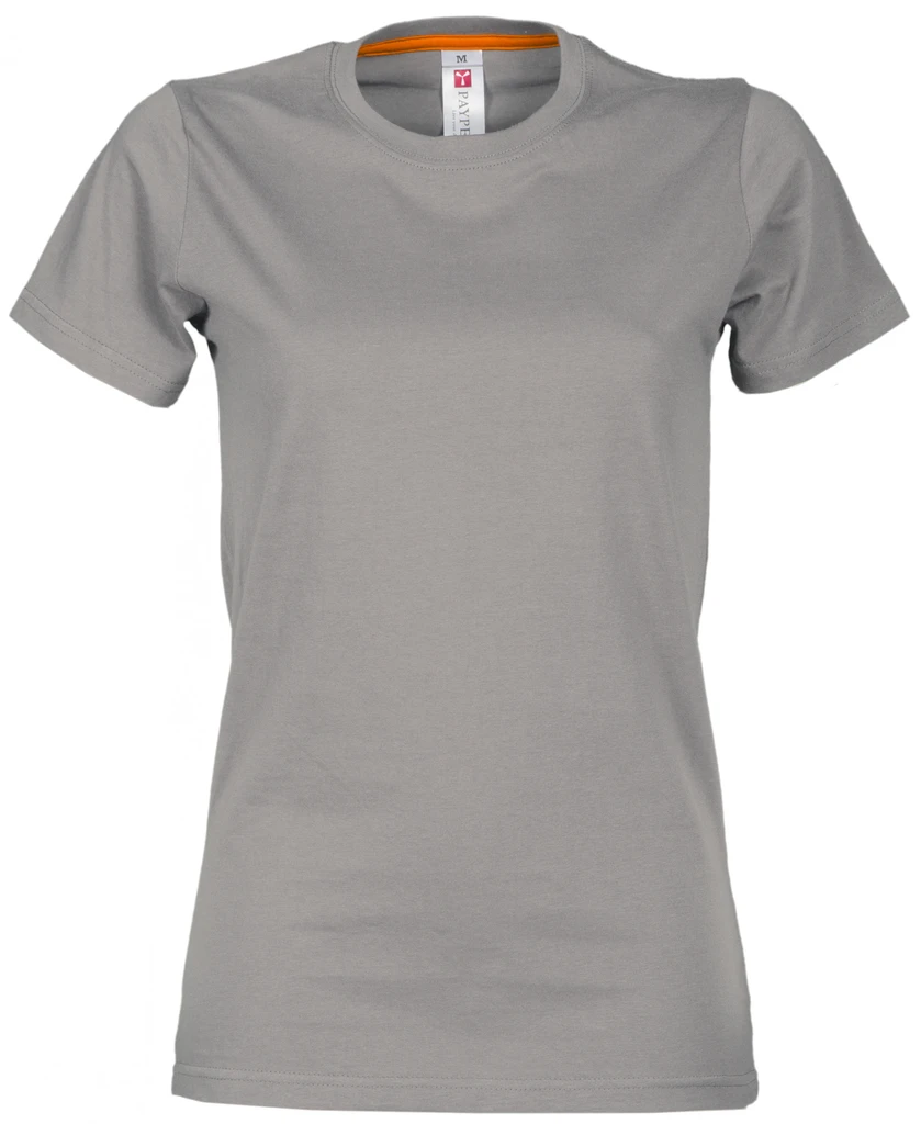 Women’s short-sleeved crew neck fitted t-shirt, with 1.5 cm spandex mix rib neckband with top stitching on the front, contrasting shoulder-to-shoulder reinforcement tape visible on the inside collar, stretch seams, side seams