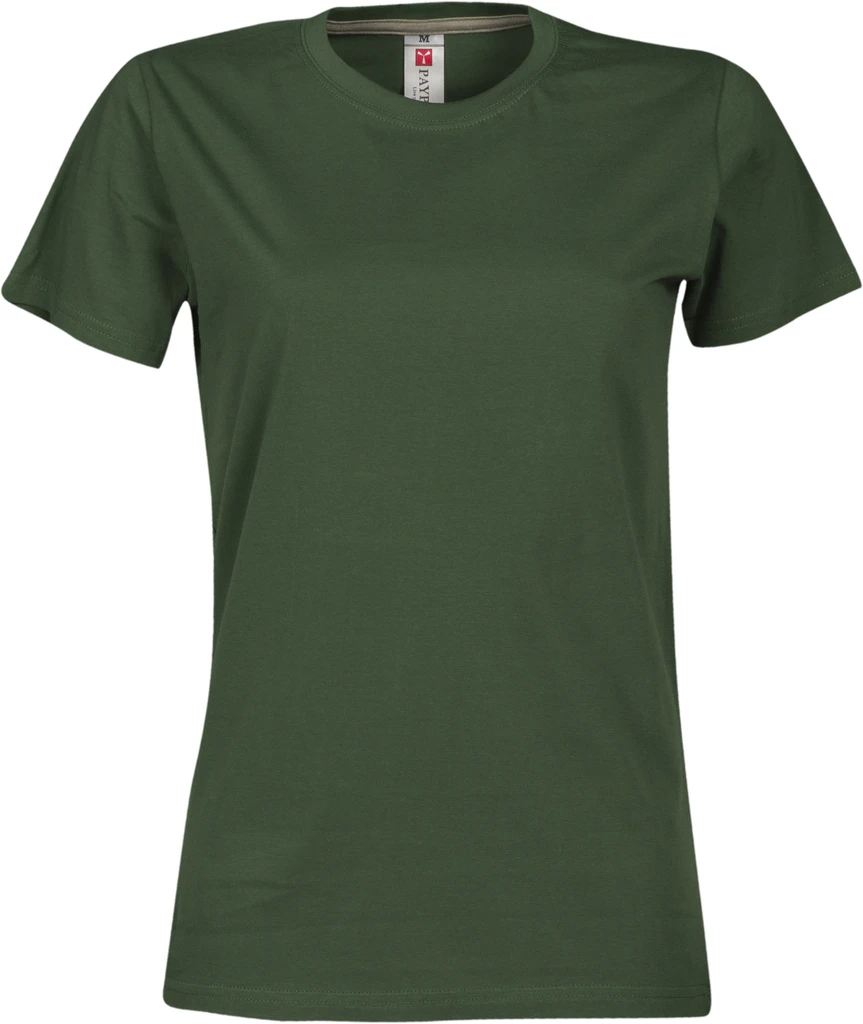 Women’s short-sleeved fitted crew neck t-shirt, with 1.5 cm spandex mix rib neckband with top stitching on the front, contrasting shoulder-to-shoulder reinforcement tape visible on the inside collar, stretch seams, side seams