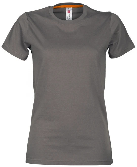 Women’s short-sleeved fitted crew neck t-shirt, with 1.5 cm spandex mix rib neckband with top stitching on the front, contrasting shoulder-to-shoulder reinforcement tape visible on the inside collar, stretch seams, side seams