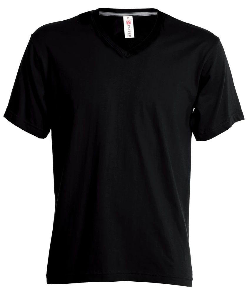 Women’s V neck fitted t-shirt, with 1.5 cm spandex mix rib neckband with top stitching on the front, contrasting shoulder-to-shoulder reinforcement tape visible on the inside collar, stretch seams, side seams