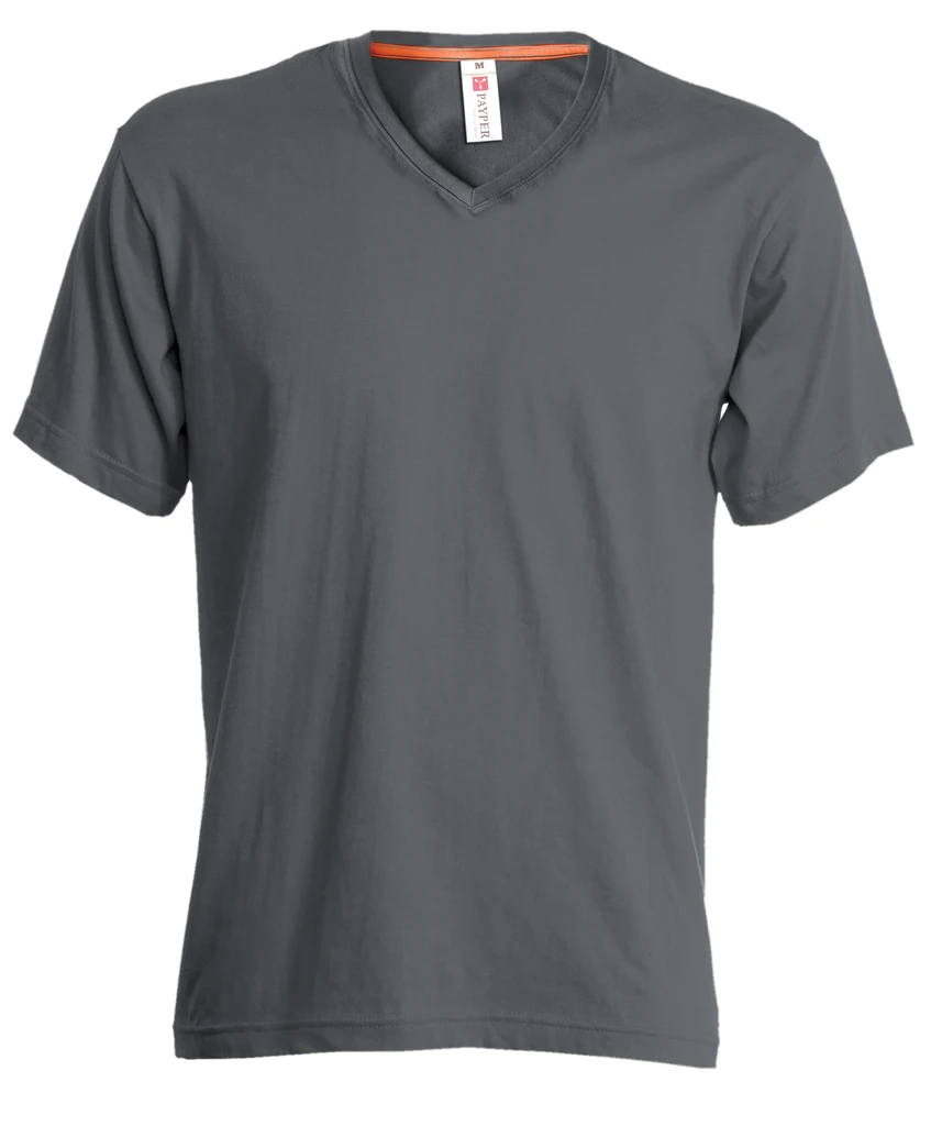 Women’s V neck fitted t-shirt, with 1.5 cm spandex mix rib neckband with top stitching on the front, contrasting shoulder-to-shoulder reinforcement tape visible on the inside collar, stretch seams, side seams