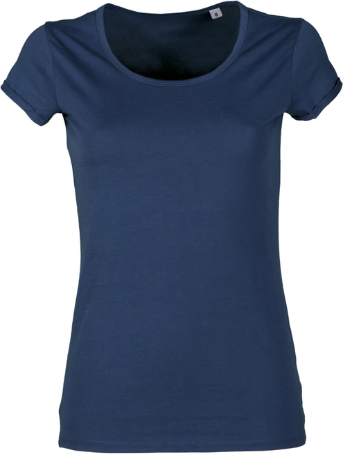 Women’s short-sleeved fitted t-shirt with slightly scooped neck, with narrow edge neckband, sleeves with narrow raw finish turn-up, side seams. No label