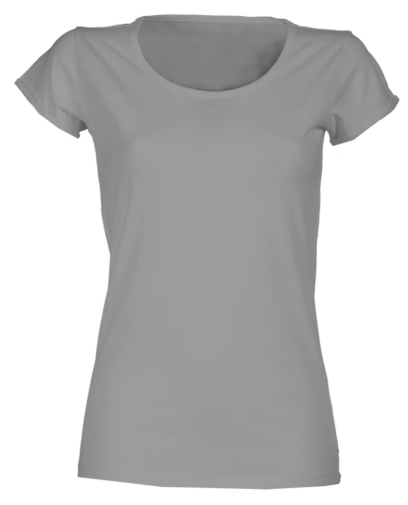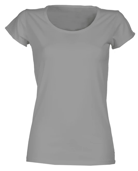 Women’s short-sleeved fitted t-shirt with slightly scooped neck, with narrow edge neckband, sleeves with narrow raw finish turn-up, side seams. No label