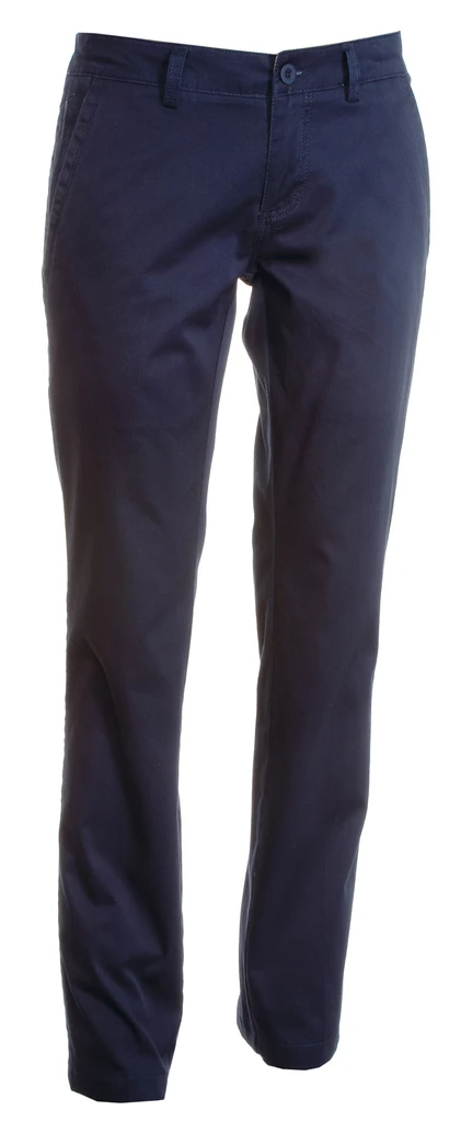 Women’s classic trousers with French pockets, a small zip pocket, two slit pockets at the back with button, zip fastening with button, belt loops at waist and patch in real leather, in combed high density two ply cotton, enzyme wash