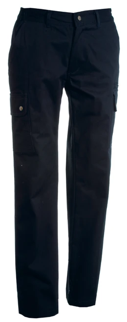 Women’s classic all-season stretch trousers with side elastic and waist belt loops, zip fastening with metal button, two classic front pockets, two large side pockets with flaps and snap fasteners, one left pocket with zip, one foldaway tape measure pocket on the right, two slit back pockets with button and buttonhole