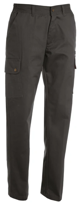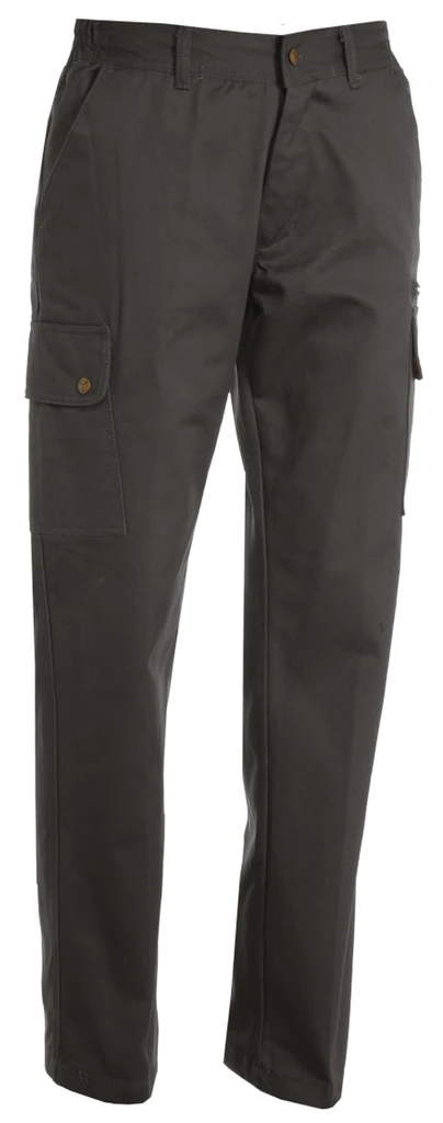Women’s classic all-season stretch trousers with side elastic and waist belt loops, zip fastening with metal button, two classic front pockets, two large side pockets with flaps and snap fasteners, one left pocket with zip, one foldaway tape measure pocket on the right, two slit back pockets with button and buttonhole