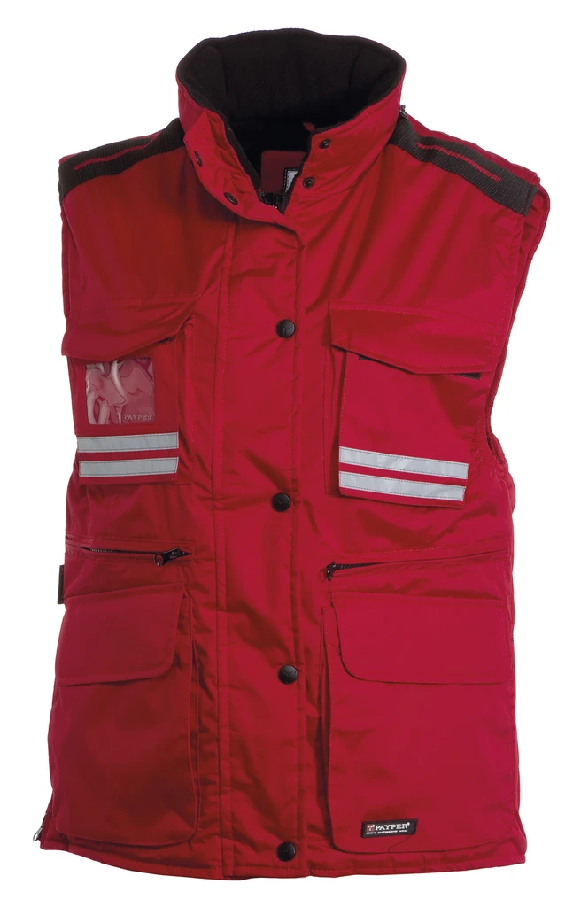 Women’s comfort-fit vest, 8 mm plastic zip with metal pull, with flap fastening and plastic buttons, detachable and/or foldaway shaped hood, grey reflective stripes on the front and back, side vent with gusset and zip, nine outer pockets, two with LOCK SYSTEM, two with zip and reinforced inner, one with a reversible badge holder. Padded, collar, back and lower back warmer in micro-fleece, inner drawstring and zip for easier printing and embroidery