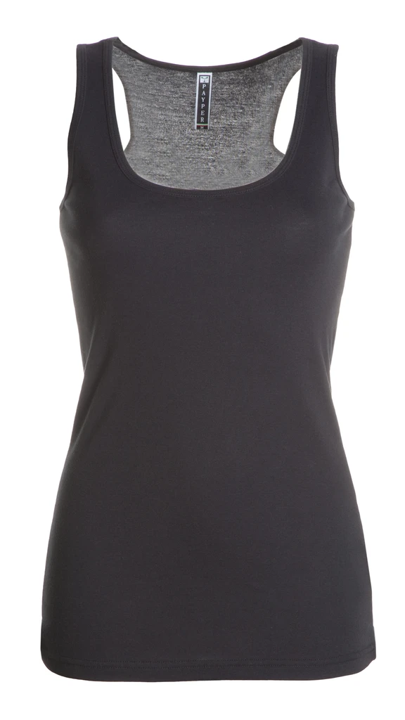 Women's fitted vest with scoop neck, 1 cm neck and sleeve edge, back straps