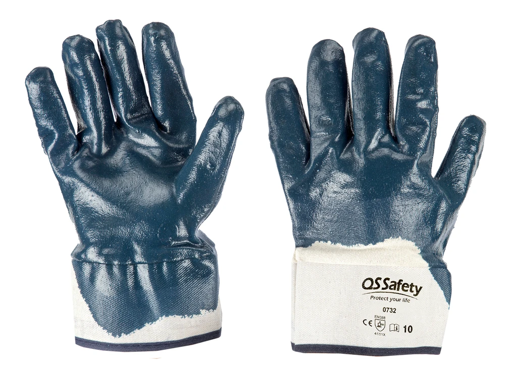 NBR gloves, ventilated back, long cuff, cotton-jersey coated; Features: sturdy, very resistant; Strengths: fit, grip, protection, resistant to liquids, practical; Areas of application: heavy-duty handling, metals, sharp and abrasive materials, oil, grease, dirt, hydrocarbons, lubricants
