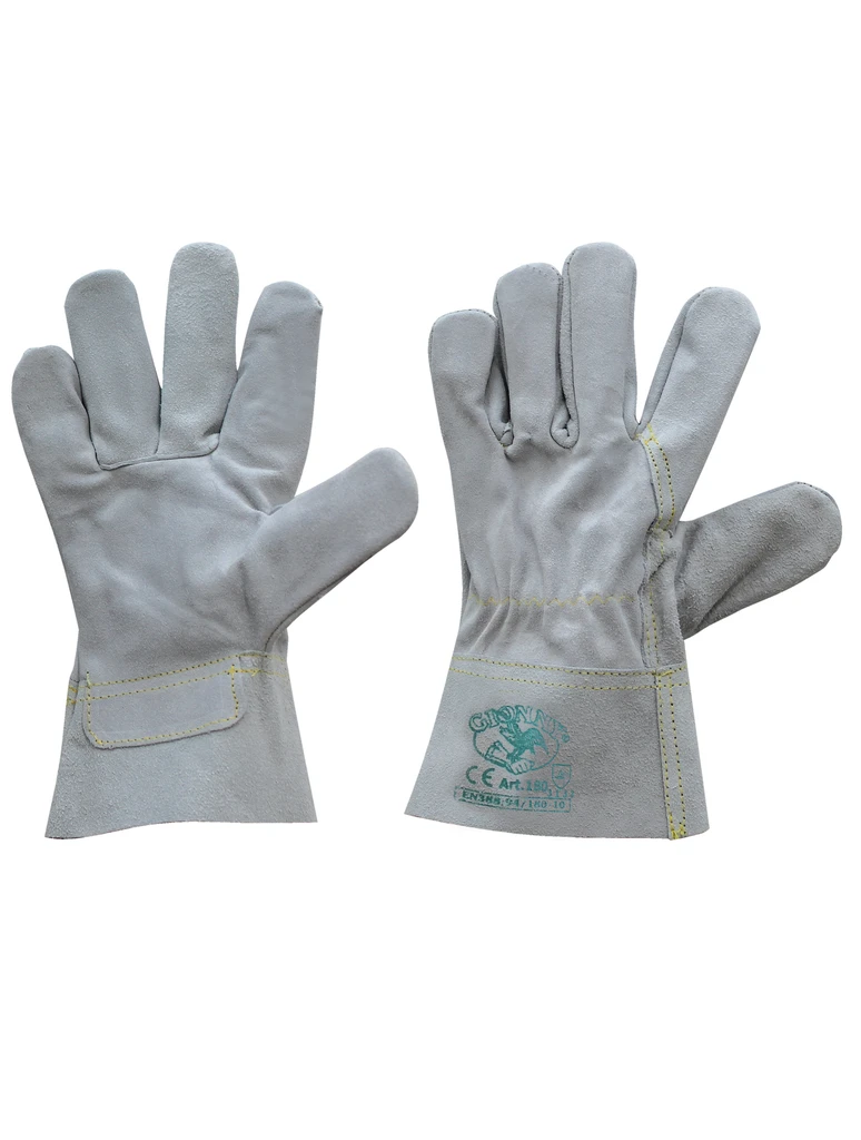 Cowhide split leather gloves - 7 cm leather cuff; Features: sturdy, very resistant; Strengths: grip, protection; Areas of application: heavy-duty handling, suitable for contact with hot, deburred material