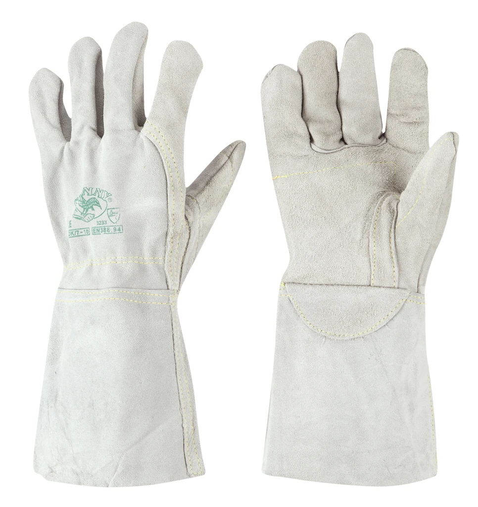 Cowhide split leather glove, double palm, wrist protection, thumb protection, finger insert, inner elastic, 15 cm split leather cuff, Kevlar stitching; Features: sturdy, very resistant; Strengths: grip, protection; Areas of application: heavy-duty handling, suitable for contact with hot, deburred material