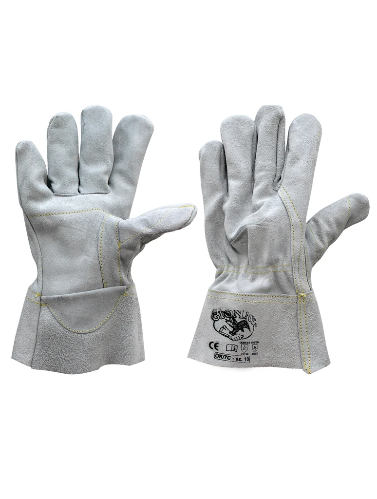 Cowhide split leather glove, double palm, wrist protection, thumb protection, finger insert, inner elastic, 7 cm leather cuff, Kevlar stitching; Features: sturdy, very resistant; Strengths: grip, protection; Areas of application: heavy-duty handling, suitable for contact with hot, deburred material