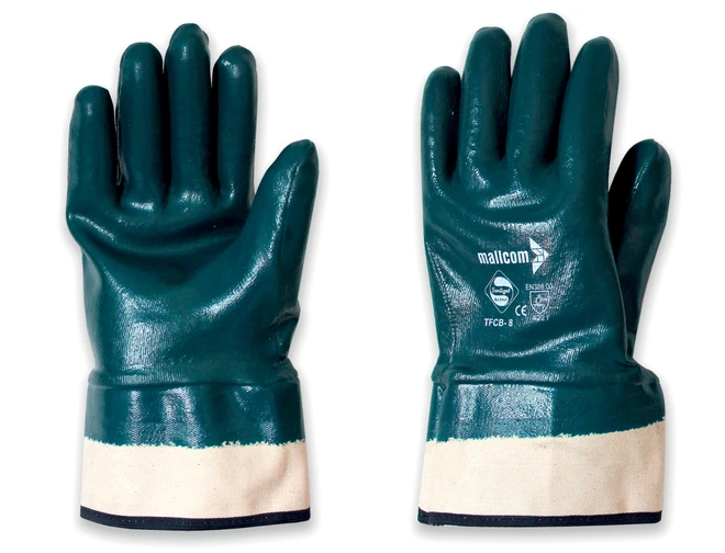 NBR gloves, fully lined, sleeve, 24 G interlock coated cotton, sanitised; Features: sturdy, very resistant; Strengths: fit, grip, protection, resistant to liquids, practical; Areas of application: heavy-duty handling, metals, sharp and abrasive materials, oil, grease, dirt, hydrocarbons, lubricants