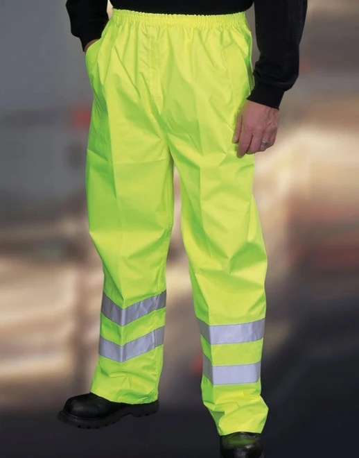 100 % polyester with PVC coating • waterproof (taped seams) • safety trouser with 3M reflective stripes • elastic waistband • side welt pockets • adjustable bottom hem with snap button closure • EN 471 class 1.