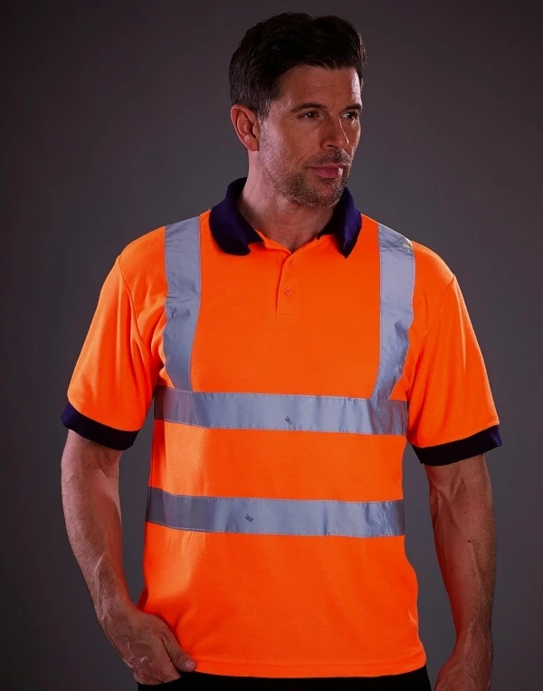 100 % polyester • safety polo with 3M reflective vertical and horizontal stripes on front and back • neck tape • 3-button placket with tone-on-tone buttons • ribbed collar and sleeve end in navy blue • double-needle stitching on bottom hem • Hi-Vis Yellow = EN 471 class 2.